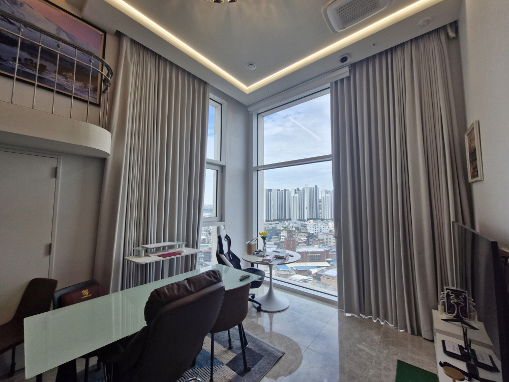 거실창에는 전동 커튼-크림 색상으로 설치 하였습니다.