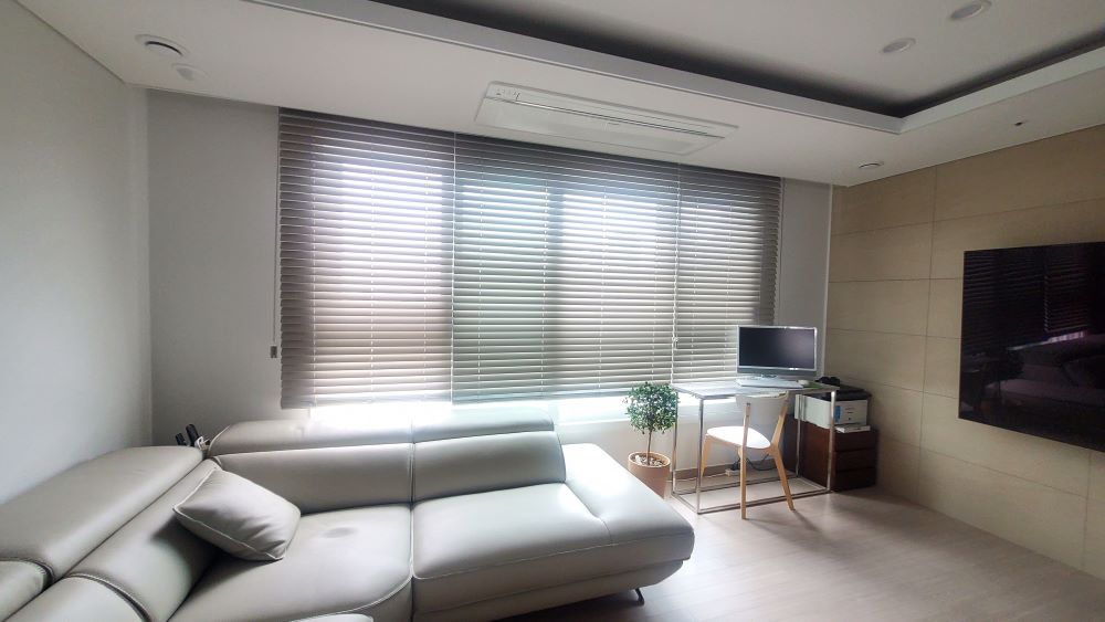 거실 창에는 프리미엄우드(1312-라이트그레이) 색상으로 설치 하였습니다.
